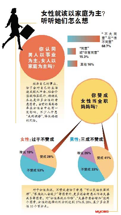廣州社情民意研究中心的調查顯示,對女性當“全職媽媽”,男性與女性的看法存在明顯分歧。女性表示“不贊成”的比例高達53%,“贊成”的不到30%;而男性卻以“贊成”者居多,為41%,明顯高于“不贊成”的33%。